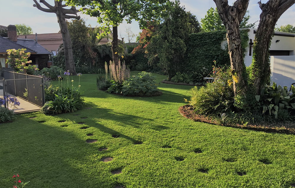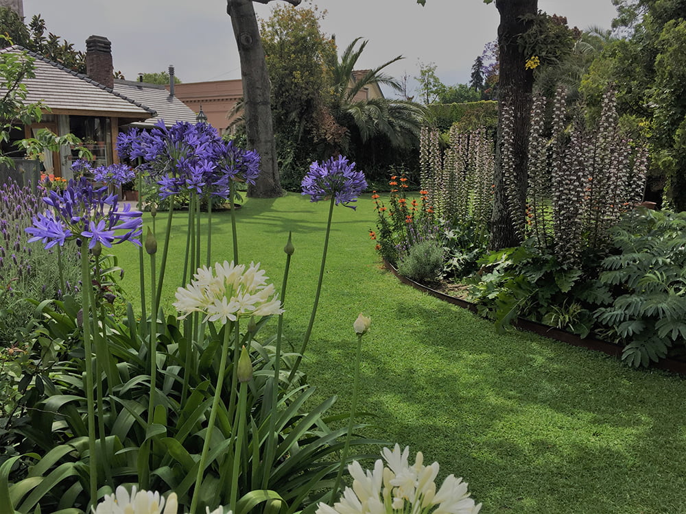 Remodelación de un antiguo jardín compuesto principalmente por especies arbóreas y arbustivas. Se modificaron los espacios existentes en el lugar, con la creación de canteros orgánicos, compuestos por especies arbustivas y herbáceas, con floraciones alternadas a lo largo del año. Cabe destacar en verano el impacto de las floraciones de especies como Acanthus mollis junto a Leonotis leonorus, dos especies que supieron adaptarse bien al lugar y potenciarse una con otra.